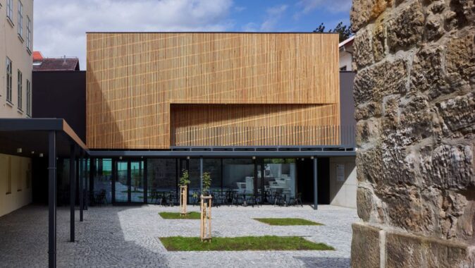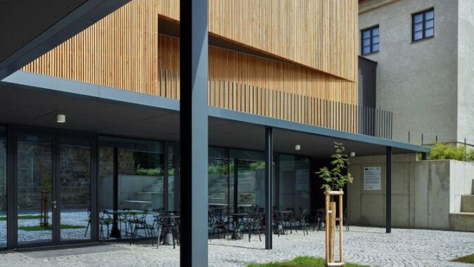 Z třetího nadzemního podlaží budovy je možné po exteriérové lávce projít do