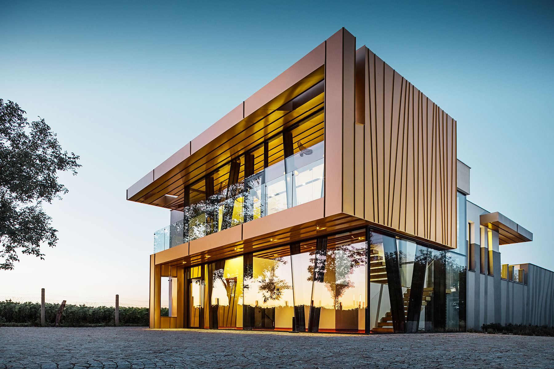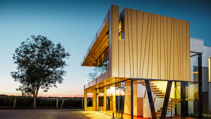 Zlatá barva skvostného bílého vína, které se tu vyrábí, zvlněná krajina Podunajské pahorkatiny a puristické materiály beton, sklo a hliník charakterizují architekturu usedlosti. Jednoduché rovné linie zlatých fasádních prvků Prefalz/Falzonal umocňují zářivý dojem z fasády budovy nového vinařství, ve které se odráží okolní příroda a víno.