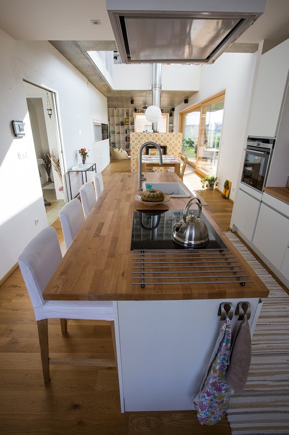 V patře jsou umístěny z chodby na galerii přístupné pokoje dětí, šatny a koupelna s toaletou. Na galerii je knihovna. Vzhledem k orientaci hlavních fasád domu jsou v přízemí a v patře navrženy velké prosklené plochy zajišťující dostatečnou světelnou pohodu v interiéru a poskytující maximální kontakt interiéru objektu s okolní zahradou.