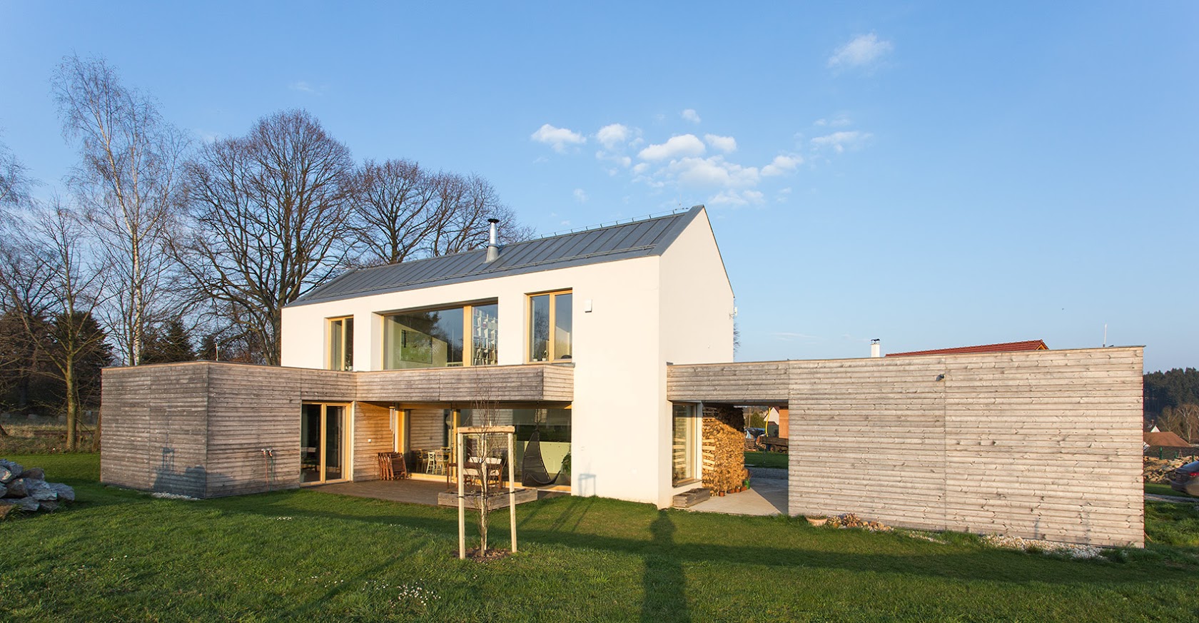 Hlavní hmota domu je omítaná, v omítce bílé barvy, nižší část je obložena světlým dřevem kladeným vodorovně. Klempířské prvky včetně střešní krytiny jsou provedeny v Titanzinku, na plochých střechách jsou položeny foliové izolace a stabilizační zásyp z kačírku. Okenní a dveřní otvory jsou osazeny dřevěnými eurookny od výrobce Slavona Slavonice.