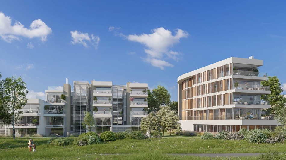 Titulní vizualizace ukazuje bytový dům Frontline Apartments, který je dílem Meier Partners Architects ve spolupráci s CUBOID ARCHITEKTI.