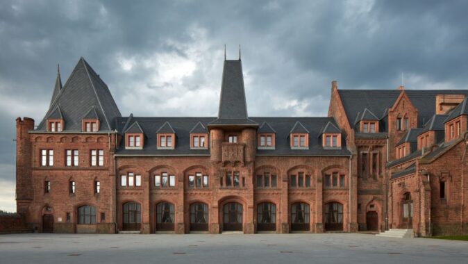 Nádvoří Červeného zámku původně plnilo funkci hospodářského dvora s mlatovým povrchem. V 70. letech minulého století bylo vydlážděno a doplněno „bazénky“ a trávníkem v centrální části. Jeho plochu jsme se rozhodli sjednotit celoplošným vydlážděním, vycházejícím z geometrie členění dvorních fasád. Veškeré zpevněné plochy byly navrženy z žuly tak, aby výsledek nekonkuroval romantickému výrazu zámku. Pro zlepšení mikroklimatických podmínek, zejména v letních měsících, je v prostoru nová fontána v provedení tzv. skryté vody.