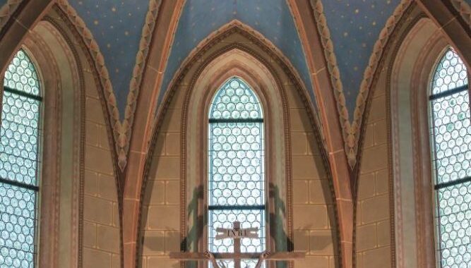 převýšená hrotitá ona s lomenými oblouky s původními vitrážovými výplněmi ze