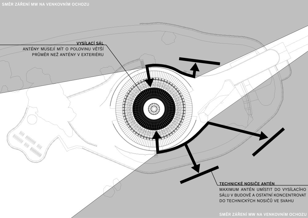 Pro nejbližší okolí stavby je důležité uvolnění od vysílacích antén a datových cest. Část antén bude přemístěna do nově zorganizovaného prostoru vysílacího sálu uvnitř laminátového pláště. Ostatní antény z exteriéru se dislokují do technicistních nosičů ve svahu kopce tak, aby opticky nerušily výhledy od vysílače a jeho siluetě z dálkových pohledů.