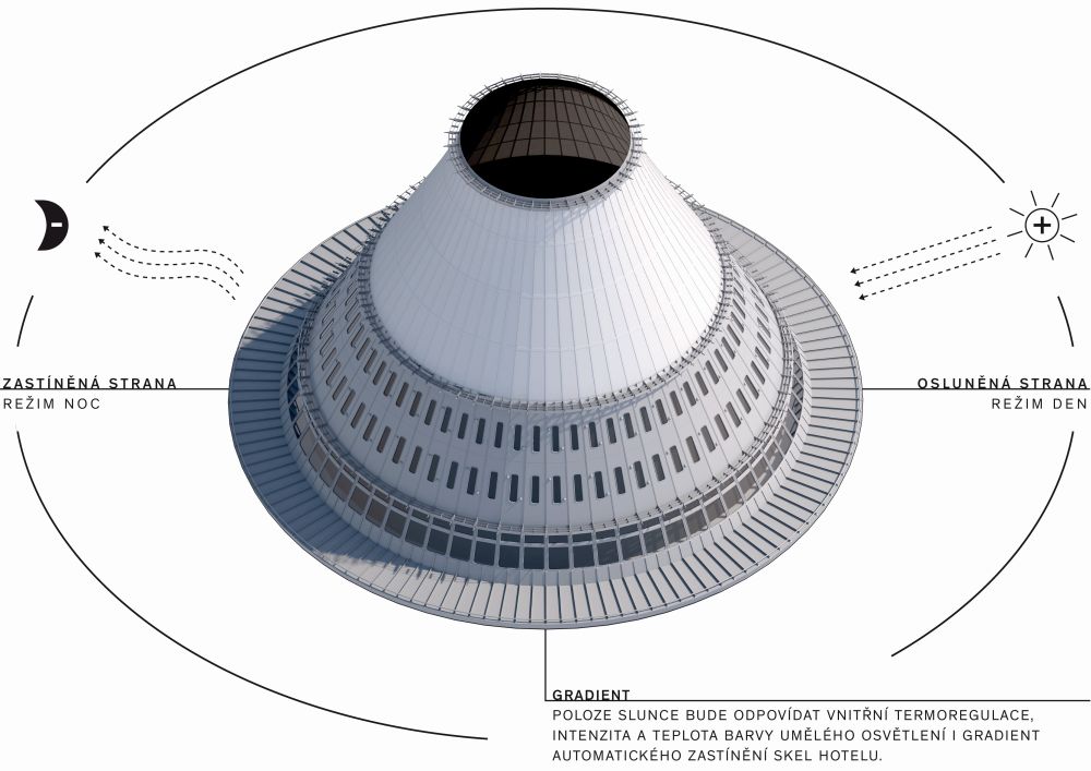 Pozornost autoři soustředili na posouzení jednotlivých sekcí opláštění. Dodatečné stavební úpravy, které původní koncepci stavby znejasňují odstranili, a to včetně anténních systémů v bezprostředním okolí stavby. Naopak navrhují nový zimní a bezbariérový vstup a celkové bezbariérové řešení pohybu po budově, dále také nové zasklení vyhlídkového ochozu. Kromě toho je součástí studie i návrh interiéru a obnova technického vybavení. Architekt Otakar Binar k tomu dodává: „Studie byla dokončena v rozsáhlé a podrobné formě srozumitelné i pro laiky. Byl jsem seznámen s celým elaborátem studie a po změnách v soutěžním projektu už vím, že volba autorů byla správná. Studie ponechává vstup na terasu v letních měsících prostřednictvím rampy. Celoročně pak bude na terasu k dispozici pro všechny hosty nově vybudovaný vstup s výtahem a schodištěm přímo z terénu. Terasa má zasklení probíhající celým obvodem s tvarovaným sklem, bez nosné konstrukce, což umožňuje nerušený celoroční výhled i celoroční využití plochy terasy. V samotném objektu je vedle stávajícího výtahu navržen nový, odpovídající imobilní normě. Tím je umožněn pohyb všem návštěvníkům po celé budově, a to je podstatné pro celé řešení rekonstrukce.“