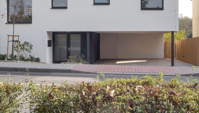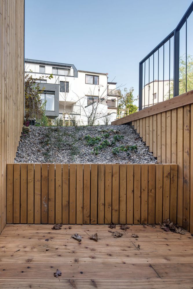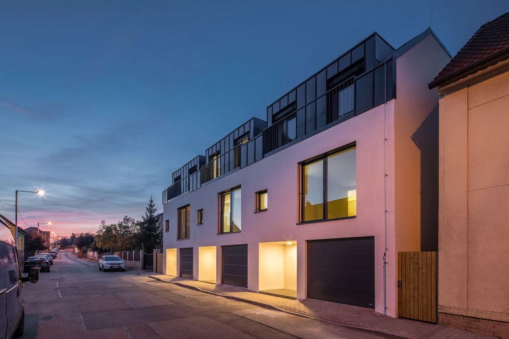 Při spodní komunikaci stojí řadový dům se třemi byty. Hmota rovněž respektuje