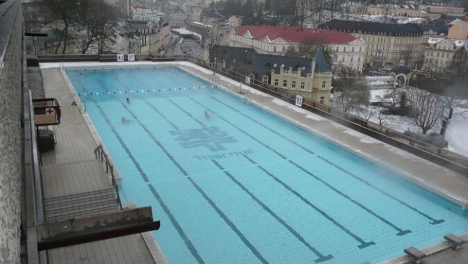 Venkovní bazén je jedním ze symbolů lázeňského města a celý hotel je
