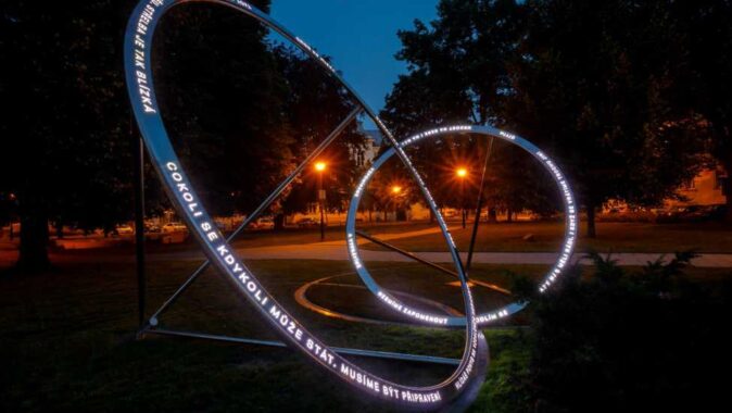 Nevím, nakolik to v reálu bude vnímáno jako památník. Na fotkách to spíš vypadá jako prolézačka pro děti Kolik lidí v dnešním prostředí přehlceném reklamou ještě něco čte? Kromě toho, myslet si, že v kruhu opřeném o tři tyče někdo pozná kužel, je dost odvážné.