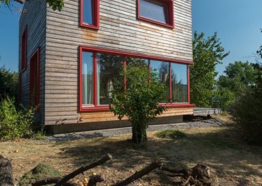 Fasáda ze sibiřského modřínu nemá povrchovou úpravu, kolem oken je výrazně