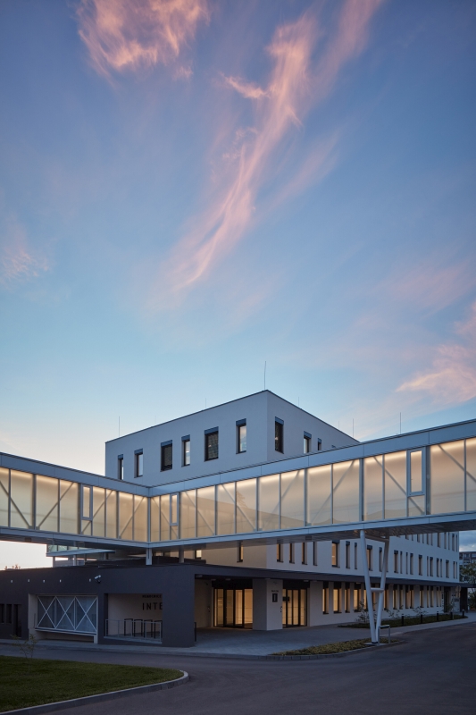 Fasáda budovy je jednoduchá a čistá, členěná velkými okny s antracitovými rámy, která svými rozměry umožňují variabilní řešení vnitřních dispozic. Bílá barva fasády umocňuje pocit světlosti a vzdušnosti, kterým nový pavilon odráží přístup moderní medicíny k pacientovi. Podstatné není jen množství denního světla a přehlednost celého pavilonu, ale také proměnlivost dne přenesená dovnitř stavby. Pro pacienty a jejich rodiny, ale i pro zaměstnance, kteří zde pracují, to znamená, že nejsou izolováni od okolního světa. Kvalitní architektura není esteticky samoúčelná, ale může mít výrazný dopad na zdraví a pohodu pacientů, z čehož návrh vycházel.