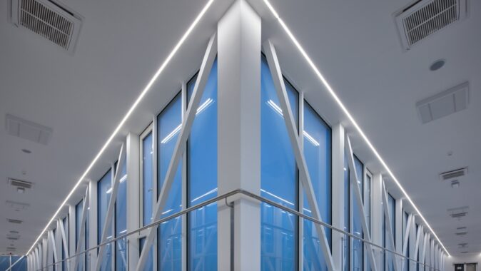 – Ocelová příhradová lávka se zavěšeným hliníkovým obvodovým pláštěm s mléčným sklem