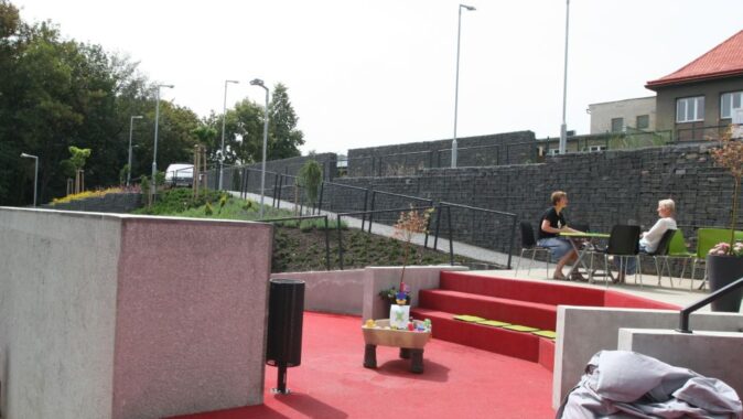 posezením vznikl na horní terase předmostí. Dále jsou zde realizovány rampy pro