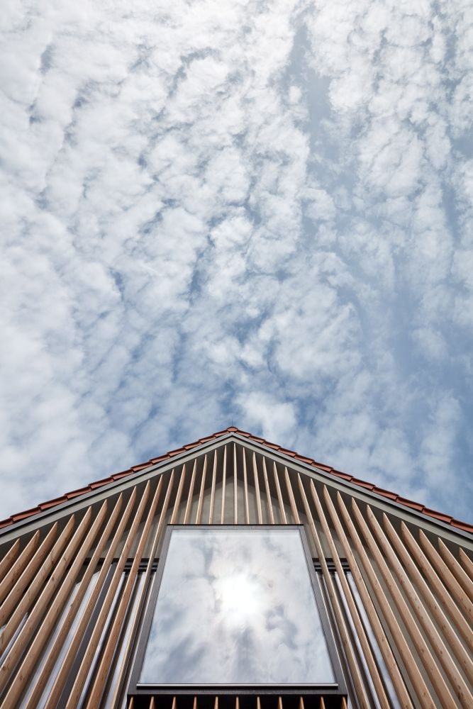 Použití svislých dřevěných lamel na štítu je skvělý nápad pro zachování vesnického prostředí, kde by celoplošné prosklení bylo moc. A vsazení okna mezi lamely je parádní třešnička na dortu.