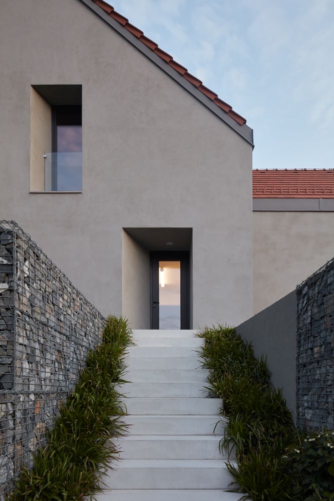 nároží z gabionu. Po obvodu domu se postupně snižuje, aby nepůsobilo jako