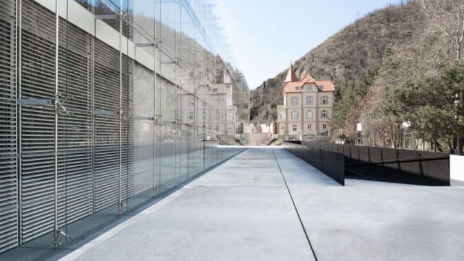 Mezi použitými materiály převládá pohledový beton kombinovaný s jemnou kovou sítí podhledů, černá stěrka podlahy a bílé truhlářské prvky a nábytkové vybavení. Prostoru dominuje variabilní sestava odpočinkového sedacího nábytku v oranžové barvě.