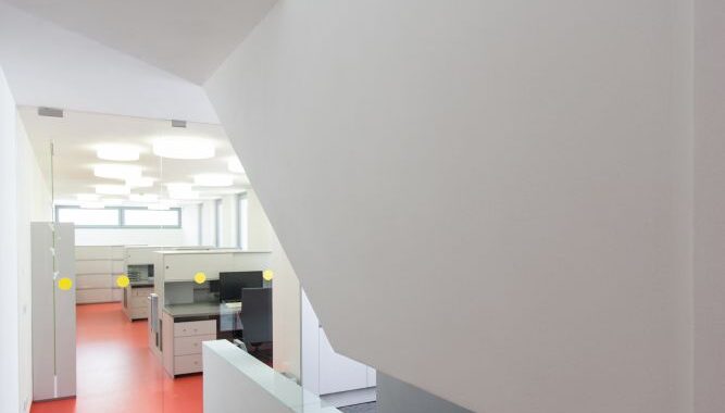 třetího podlaží jsou ovlivněny stíněním kanceláří sousední budovy. Obě budovy administrativy (původní a nová) propojuje