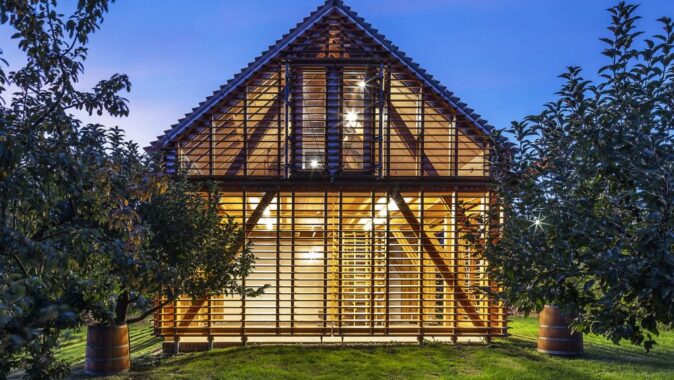 struktuře a konstrukci kontrastní transparentní dřevostavbou se zenovou