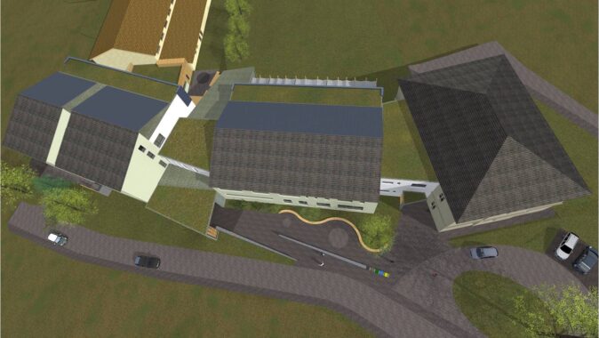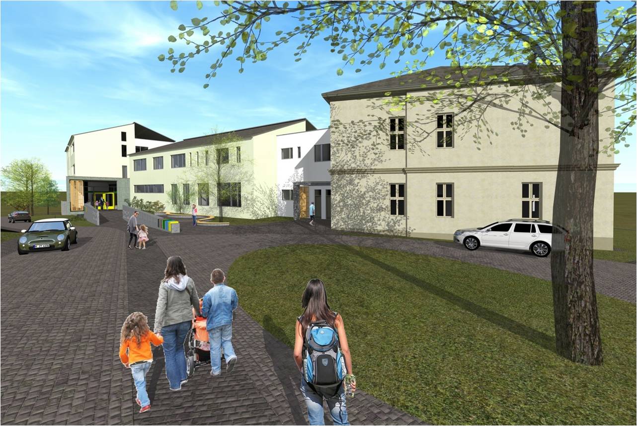Dostavba školy skládá z dvou hlavních a třech doplňujících objekty, které budou se stávajícími budovami tvořit jeden celek. Všechny jsou projektovány tak, aby splňovaly parametry pasivního domu. Základní myšlenku celému projektu dal Ing. Arch. Aleš Brotánek, který má dlouholeté zkušenosti s projektováním pasivních domů.