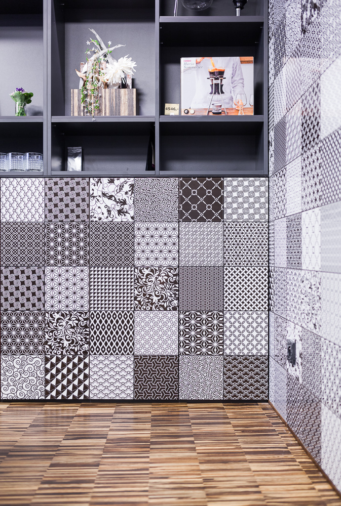 Koncepci materiálů doplňuje designový keramický obklad s černobílou grafikou. Obklad