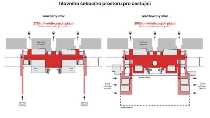 Součástí návrhu je zvětšení vytápěných čekacích prostor pro cestující v blízkosti vlaků, a to zhruba o 1250 m2. Kapacita pro čekání v této části haly bude minimálně 2 tisíce osob. Navíc bude možné využít čekací prostory v nově zrekonstruované historické Fantově budově. V blízkosti prostor pro čekání vzniknou vytápěné obchody, kavárny a restaurace, další budou umístěné v zastřešené venkovní části ve všech třech úrovních haly. Celková plocha určená pro služby cestujícím a obchody se oproti současnosti zvětší o 1000 m2.