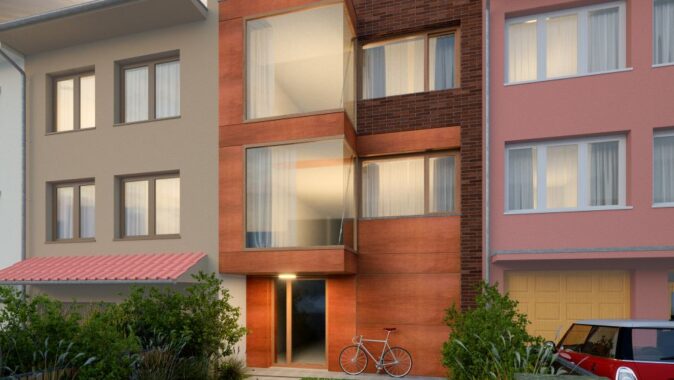 Z ulice bude fasáda opatřena cihelným obkladem v kombinaci s dřevěným