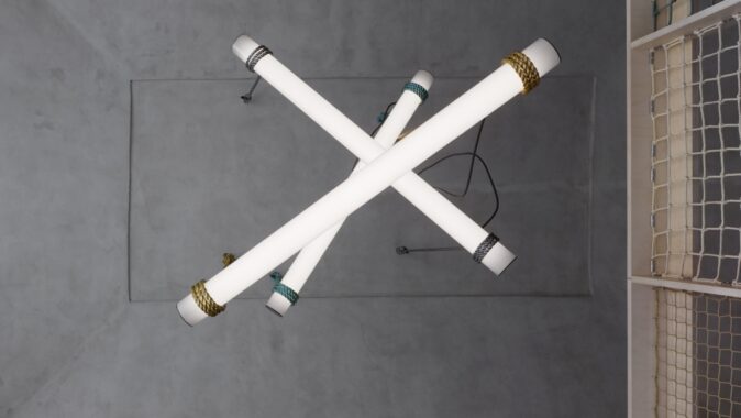 Osvětlení provozovny je navrženo autorsky v každém poli instalací tří trubkových světel zavěšených v prostoru na různě barevných lanech.