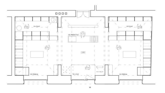 Naším návrhem propojení a vybourání zdí jsme prostor spojili v ucelenou jasnou dispozici. Navrhli a přesunuli jsme vstup do obchodu do středové části spojené dispozice, kde jsme umístili prodejní pult a centrální výstavní regál. Důležitý byl pro nás prvek možných vysokých stropů s klenbami. Odstranili jsme všechna vestavěná patra a navrátili prostorům původní výšku. V krajních prostorách obchodu jsme navrhli vložená půlpatra, která hmotově nenarušují pocit z vysokých prostor. Pod těmito půlpatry jsme ze strany prodejny navrhli regály s cívkami s lany a provazy, pod podlahou půlpater jsme umístili sklady pro prodejnu. Do horních vestavěných půlpater se vystoupá po schodištích, pod kterými jsme také navrhli regály s cívkami. Obě vestavěná půlpatra jsou navržena jako další prodejní plocha.