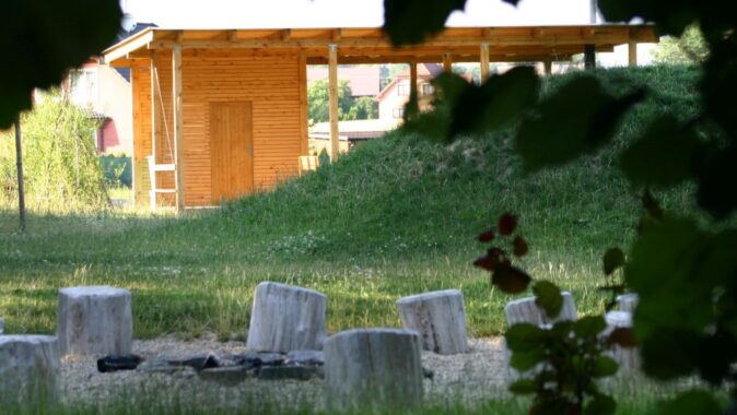 venkovní učebna s krbem a skladištěm. Celou zahradu propojuje nová koloběžková