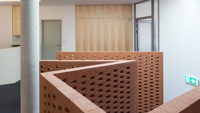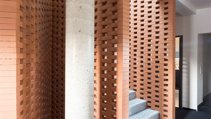 prostoru dominuje schodišťová stěna z broušených a lepených cihel, které