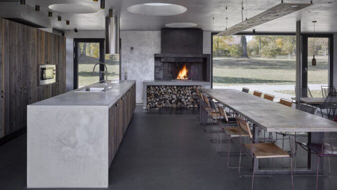 doplněných krbovými kamny a krbem s grilem a ohništěm.
