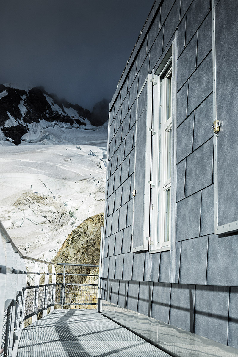 francouzského útočiště pro horolezce vytvořila pomocí střešních a fasádních
