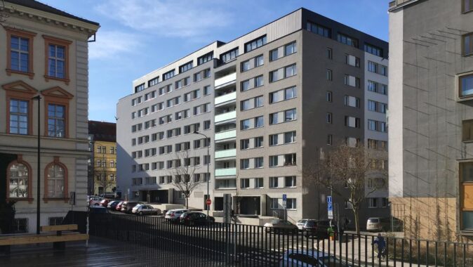 slepým štítem na pohledově exponovaném nároží Jeseniova – Rokycanova.