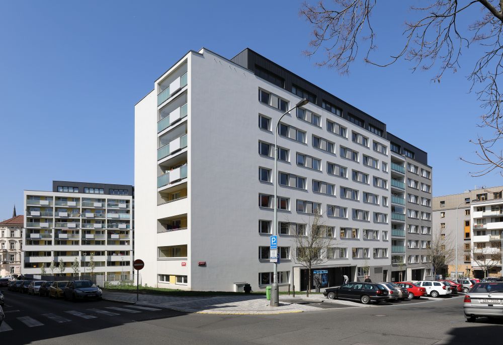 Žižkova, terasovitě uspořádané lodžie ve vnitrobloku tu působí exoticky.
