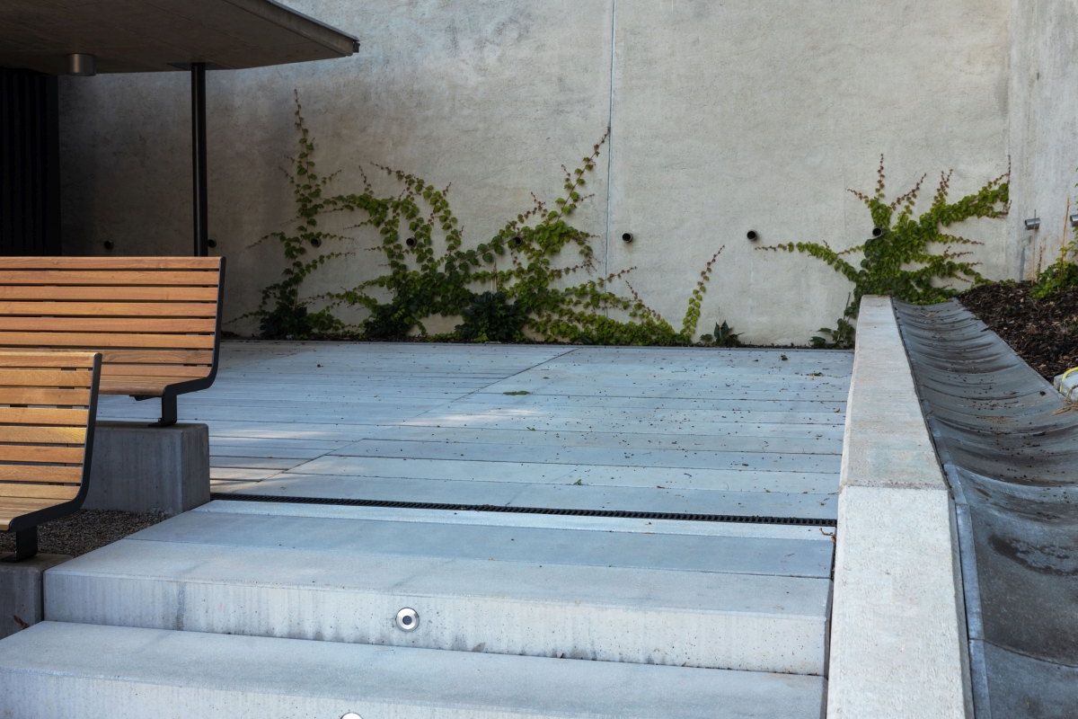 Architektonické řešení jednotlivých částí kina, volba materiálu a barevnost jsou založeny na symbióze areálu letního kina a okolní přírody. Hlediště s bočními schodišti je postaveno z prefabrikovaných betonových dílců, na kterých jsou osazeny ocelové lavice s akátovými lamelami. Betonové jeviště a okolní zpevněné plochy z prefabrikovaných velkoformátových dlažeb umožňují instalaci různě velkých scén a akcí všeho druhu. Promítací objekt s výrazným betonovým zastřešením baru je obložen trapézovým plechem, který je zároveň použit i na zastřešení ocelové konstrukce promítacího plátna.