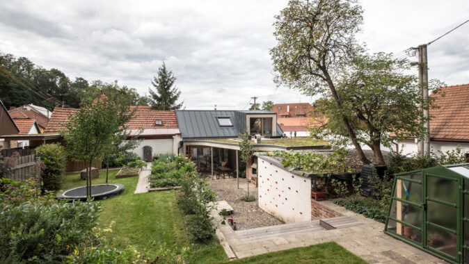 Jako třeba v podobě velkých prosklených ploch hliníkových oken nebo elektricky ovládaných střešních oken, kterými architekti pustili přirozené světlo do tmavého interiéru svého domku na dně lomu blízko skalní stěny. Architekti Radim a Hana Horákovi si bydlení nedaleko centra Brna a zároveň u řeky a lesa oblíbili, je to pro ně „taková vesnice ve městě“, rostoucí děti je však přiměly pustit se do rekonstrukce.