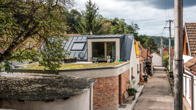 Pohledově je rekonstrukce s přístavbou kombinací železobetonu, starých plných pálených cihel, omítky, zelené vegetační střechy a antracitových klempířských prvků. Výplně otvorů jsou navrženy jako hliníkové s trojsklem, stejně tak i celoprosklené vstupní dveře, které umožňují kolemjdoucím průhled přes dům až do dvora. V interiéru se jedná o kombinaci různých přírodních materiálů. „Zvažovali jsme i dřevěná okna, přece jen je náš dům „tradičnější“, ale hliníková okna a posuvy Schüco pro nás měly větší výhody. Rozhodla především jejich bezúdržbovost, příznivá cena, i barevnost rámů eloxovaných do bronzova. Eloxovaná povrchová úprava vizuálně zachovává kovový vzhled hliníku, okna nejsou opatřena nátěrem, což koresponduje s dalšími použitými materiály v domě,“ vysvětluje svou volbu Ing. arch. Radim Horák.