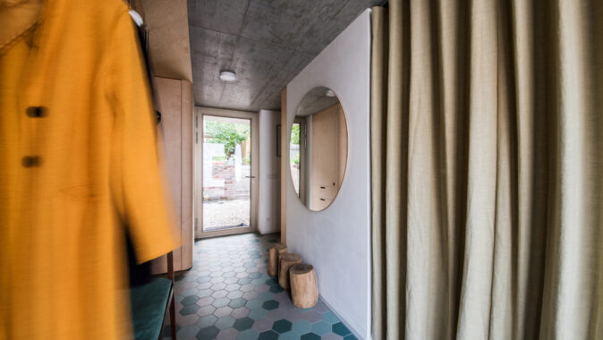 Vstup do domu byl přesunut do nové přístavby, která je navržena s co nejmenší konstrukční výškou (světlá výška uvnitř je jen 2.3 m a stropy jsou řešené jako pohledové železobetonové). Na vstup navazuje chodba, kterou lze projít domem do dvora, hned za dveřmi při vstupu je navržen technický kout, na druhé straně je za posuvnými dveřmi malá lichoběžníková pracovna (reaguje na tvar pozemku). Před dveřmi do dvora se chodba stáčí podél krytého venkovního sezení a míří do původního objektu, podél ní je navržena knihovna, ve které jsou umístěny dveře na samostatné WC a do koupelny. Ta je uvnitř prosvětlena střešním světlíkem, rovněž elektricky ovládaným.