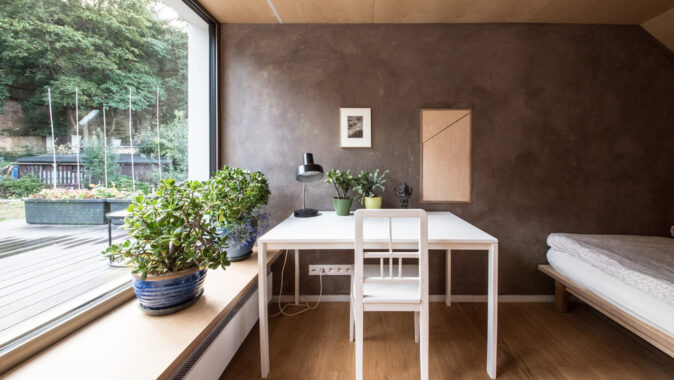 Nová přístavba má na podlaze ve hmotě probarvenou dlažbu, stará část pak třívrstvou dřevěnou dubovou lamelu. Celým domem prochází přírodní březová překližka (nábytky, obklad vstupu, dveře, podhled obývacího pokoje a ložnice), lokálně pak probarvená překližka (modrá – odpočinkový kout obývacího pokoje, růžová – kuchyň). „Máme rádi barvy, proto jsme se nápadu naší dcery s růžovou kuchyní nezalekli a snažili se tuto ne úplně obvyklou barvu vhodně materiálově a barevně doplnit,“ pokračuje Ing. arch. Radim Horák. Speciálním prvkem kuchyně je i tzv. chytrá stěna, magnetická a popisovatelná zároveň – děti mají kde malovat, rodiče zase prostor třeba na nákupní seznam…