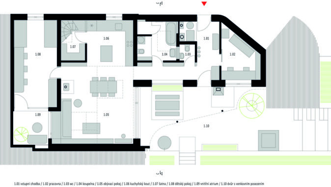 Na straně do dvora tvoří obvodovou část více skleněných ploch než neprůhledných zdí a přirozené světlo pustili do domu i střešními okny. V části pod sedlovou střechou v původním objektu je obývací pokoj s jídelním stolem. „Prostor je zcela otevřen do střechy a kromě rozsáhlé prosklené plochy z hliníkového HS portálu je prosvětlen i shora, dálkově ovladatelnými střešními okny, s vnitřním i vnějším zastíněním,“ popisuje Ing. arch. Radim Horák.