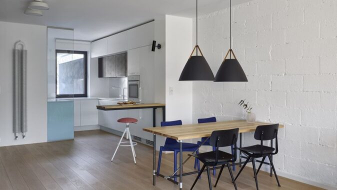 Střízlivý interiér s barevnými akcenty a texturou povrchů