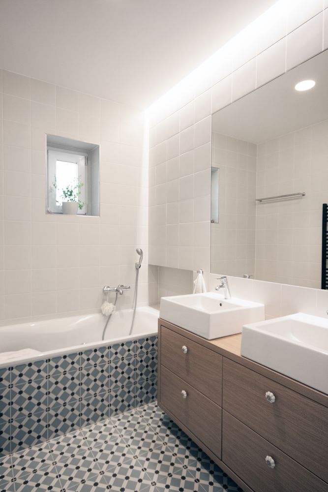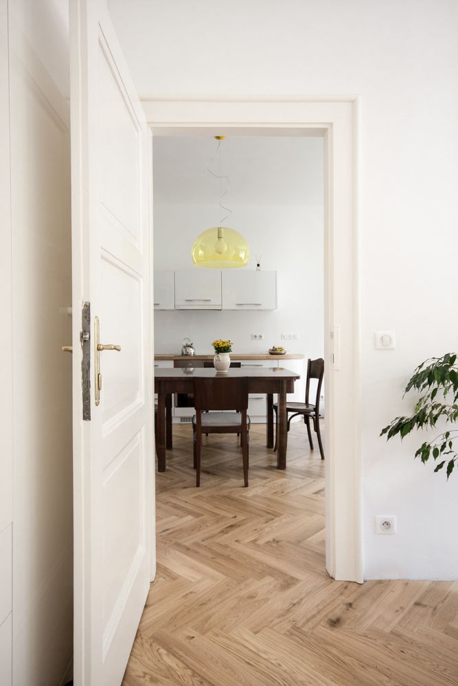 Byt o velikosti 70 m2 se nachází ve vile z meziválečného období. Snažili jsme se využít jeho potenciál a upravit ho pro současné bydlení: postrádal dostatečné množství denního světla ve vstupní hale a dispozičně nevyhovoval požadavkům mladé rodiny s dítětem.