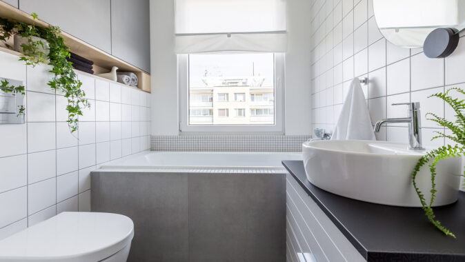 světlá koupelna s velkým oknem. Kuchyni jsme pak přičlenili k obývacímu