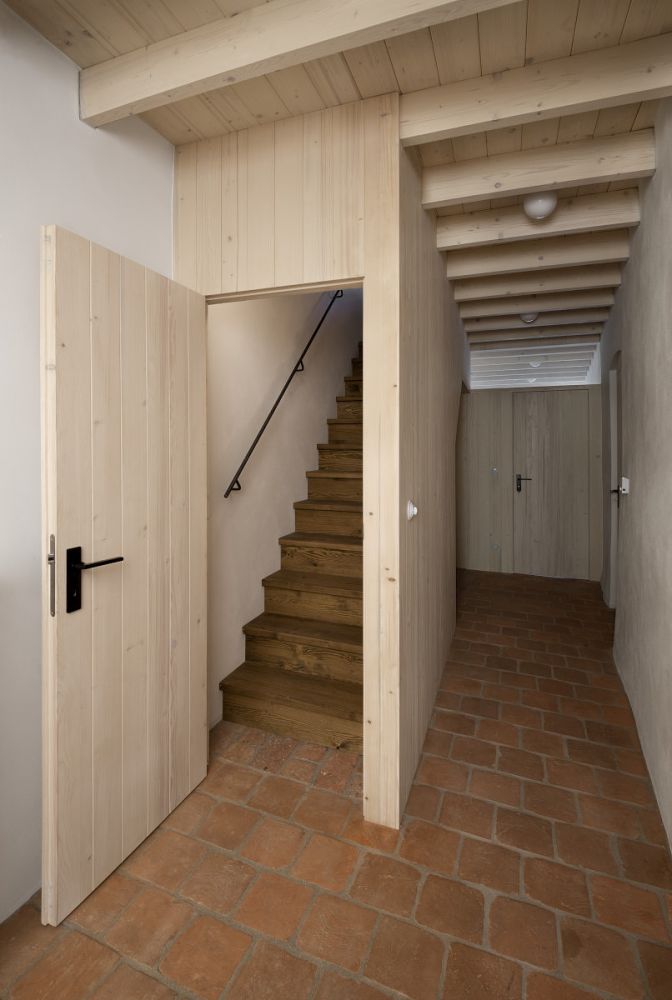 Na zadláždění chodby jsme navrhly využít staré půdovky. Pro kuchyň, komoru a koupelny byla zakázkově vyrobena dlažba s historickým vzorem. Ostatní podlahy jsou dubové.