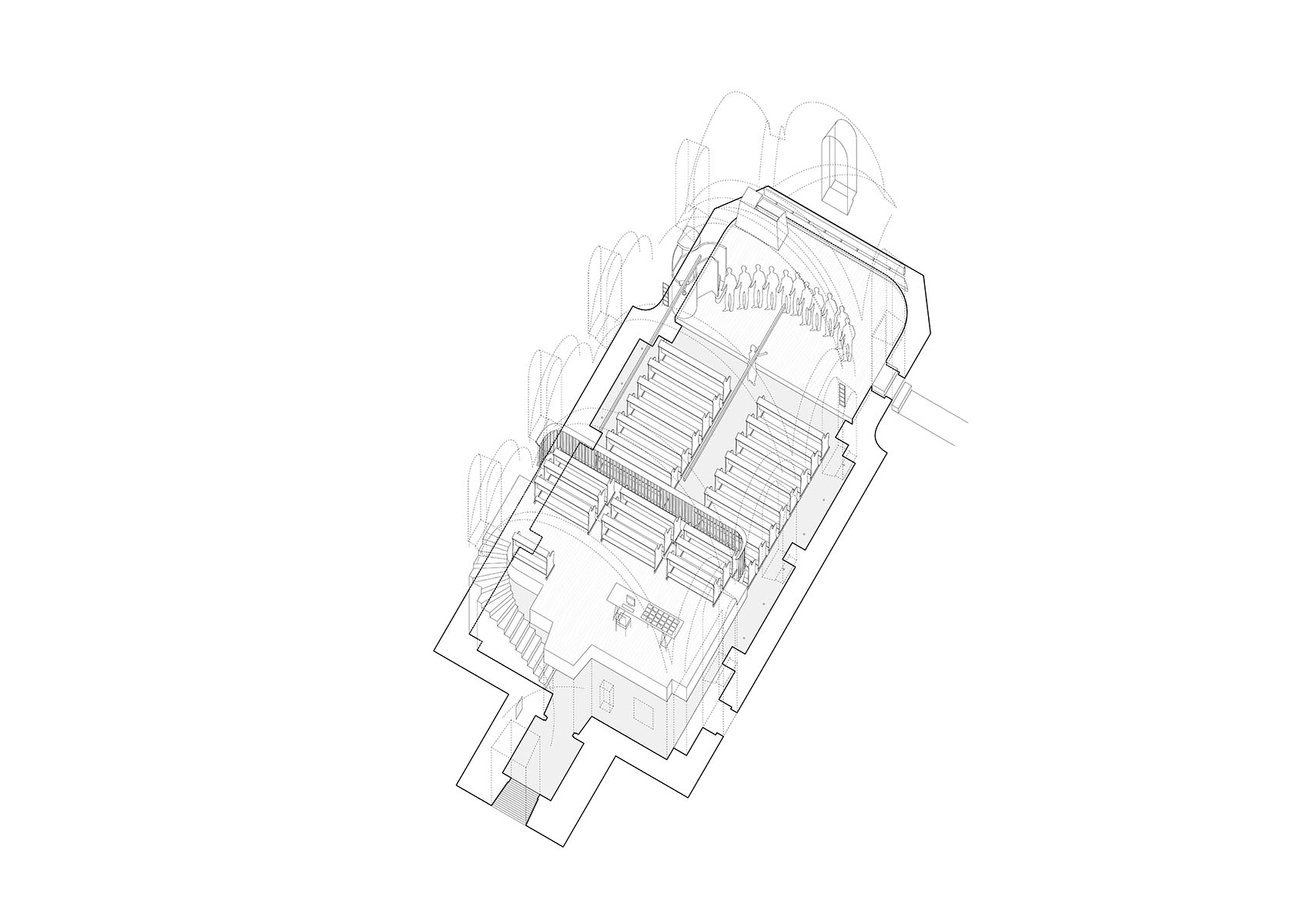 Páně; zvýrazněna je tak charakteristická vitráž v čele kostela. Za vstupní předsíní je navrženo zázemí pro církevní i
