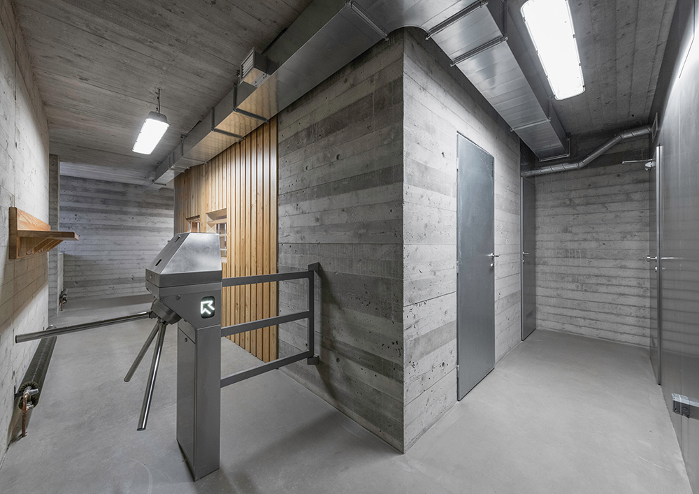 toaletách. Nejvýraznějším motivem je přístavba z pohledového betonu, který se