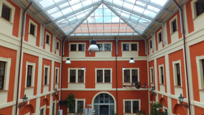 ocelové střešní konstrukce. Prosklené zastřešení historického nádvoří