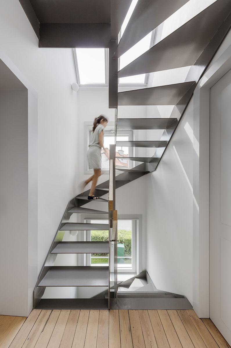 střešními okny v horní části schodiště, přičemž otevřenými dveřmi a okny proudí