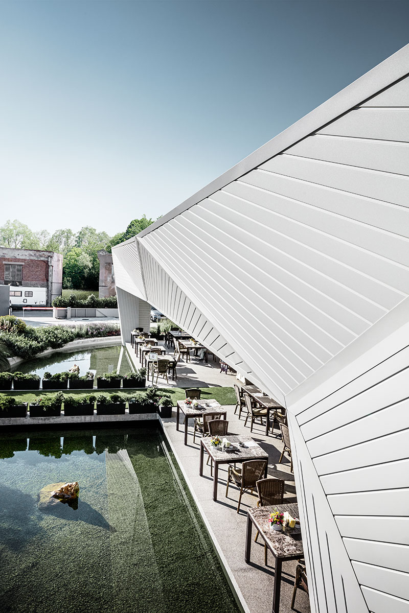 zařízená restaurace s čistě bílou hliníkovou fasádou jako ostrov naděje.
