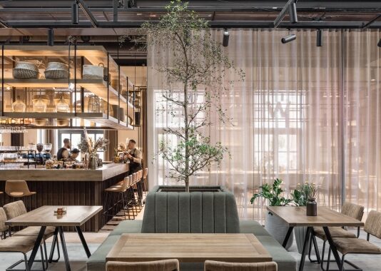 Na pozadí priznanej industriálnej vrstvy interiéru a subtílnych vložených oceľových prvkov pracujú architekti s masívnymi materiálmi a hrubými povrchmi. Nezvyklá tehla, kladená v stromčekovom vzore na časti podlahy, cortenová konštrukcia barového pultu, drevená doska baru, masívny kameň na kuchynskom ostrove… Mäkká koža a textil v kontakte so zákazníkom. Nenájdete tu umelú hmotu, ale materiály, ktorým nevadí opotrebenie a patina.