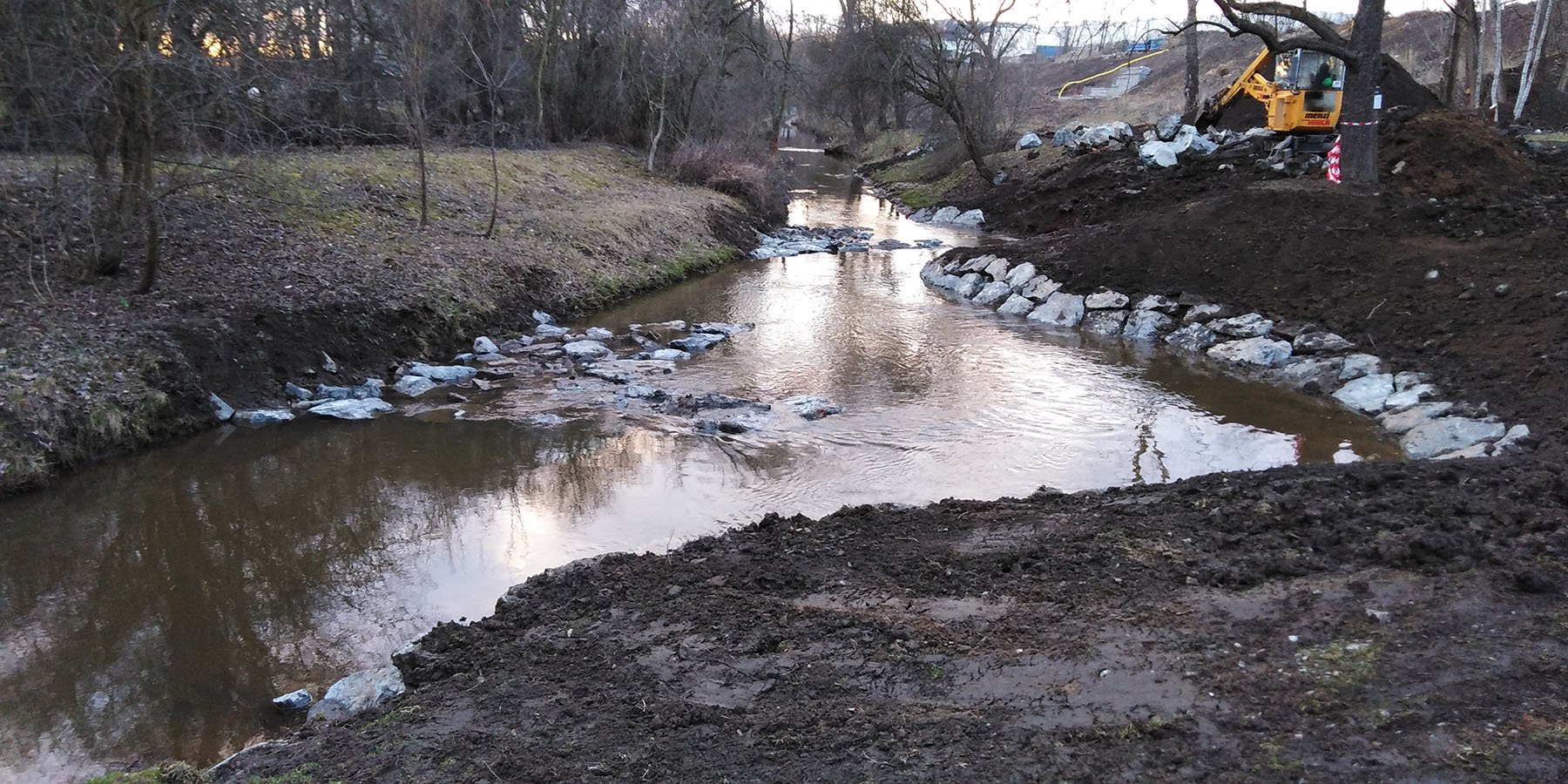říčka zrychlila. YIT se chystá meandry osít vodními rostlinami. „Revitalizací Rokytky chceme zvýšit